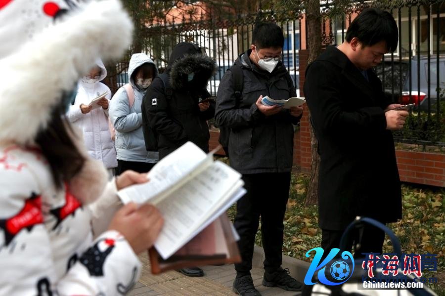费力图:2023年11月26日,北京第十二中学校本部考点外,考生在入场前温习。中新社记者 易海菲 摄