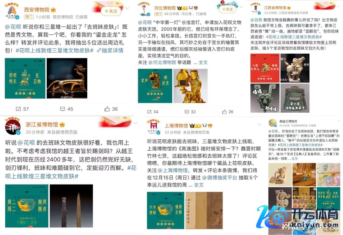 年青东谈主对传统文化的关心,也蛊惑了稠密文博机构纷纷下场。今日,#花呗上线敦煌三星堆文物皮肤#登上微博热搜后,近50家博物馆@花呗“在线报名”:圆明园古迹公园保举马首铜像,浙江省博物馆保举越王者旨於睗剑,上海博物馆保举高逸图,西安博物馆保举鎏金走龙,南越王博物馆保举圆雕长袖玉舞东谈主像……争相给自家的宝贝苦求上皮肤。
