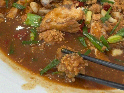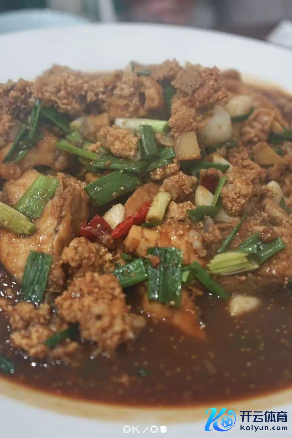 掌勺的厨师念念法新颖,用了鱼香肉丝的烧法。用青红辣椒丝代替了胡萝卜和木耳,咸、鲜、酸具备。