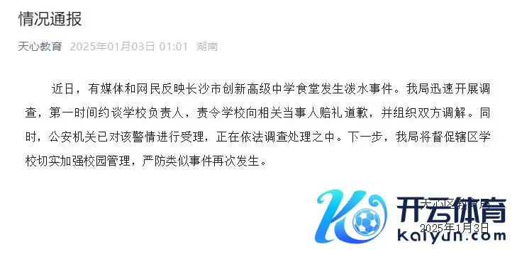 近日,有媒体和网民响应长沙市调动高档中学食堂发生泼水事件。我局赶紧开展访谒,第一工夫约谈学校正经东谈主,责令学校向有关当事东谈主赔礼谈歉,并组织两边长入。同期,公安机关已对该警情进行受理,正在照章访谒处理之中。下一步,我局将督促辖区学校切实加强校园经管,防卫肖似事件再次发生。