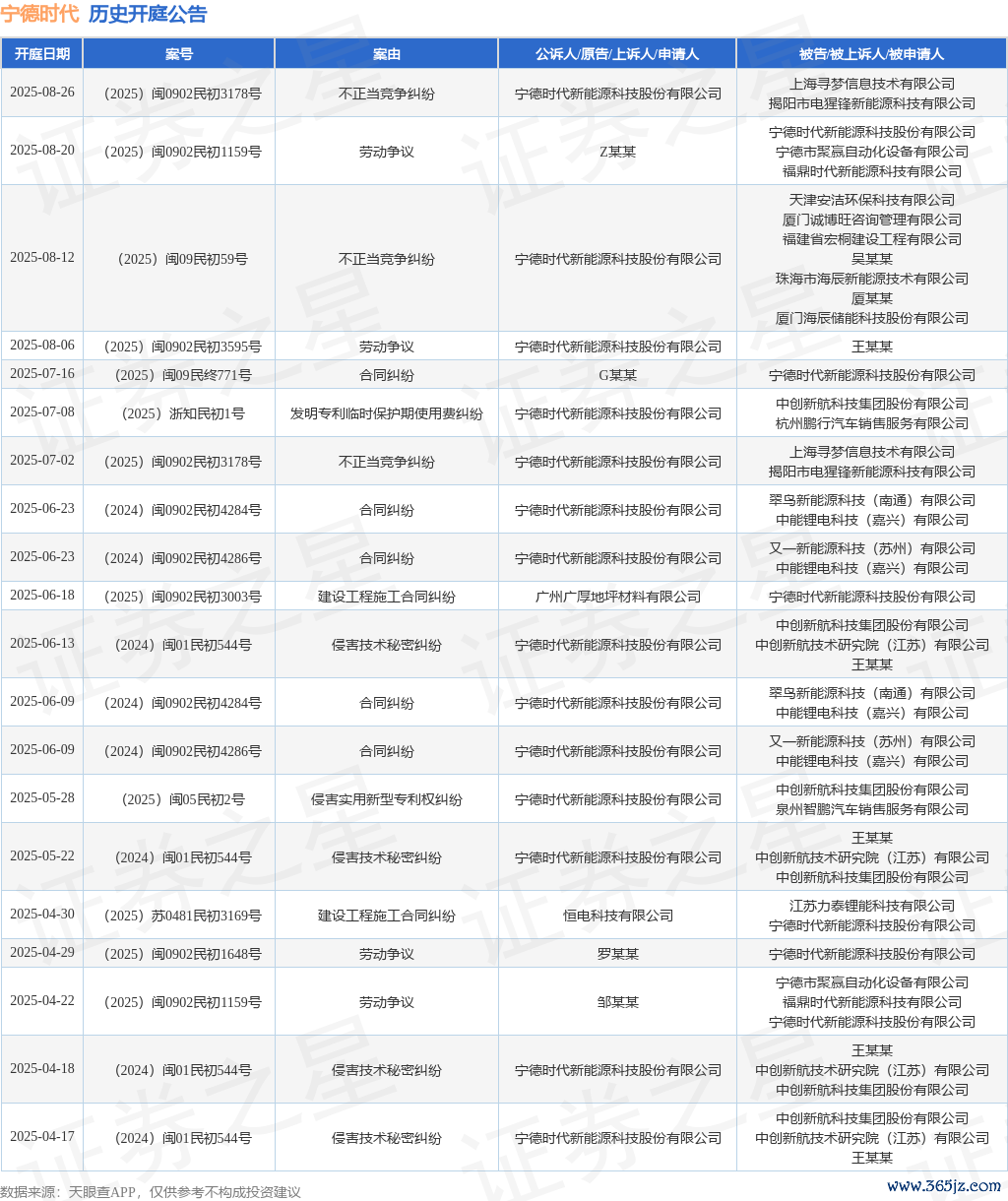 案号:(2025)闽09民初59号审理法院:福建省宁德市中级东说念主民法院案由:不正直竞争纠纷当事东说念主信息: 原告/上诉东说念主:宁德期间新动力科技股份有限公司 被告/被上诉东说念主:天津安洁环保科技有限公司、厦门诚博旺斟酌惩处有限公司、福建省宏桐诞生工程有限公司、吴某某、珠海市海辰新动力时期有限公司、厦某某、厦门海辰储能科技股份有限公司开庭日历:2025年8月12日笔据统计,近一年内以宁德期间新动力科技股份有限公司为当事东说念主的历史开庭公告有40则,其中案由为“左券纠纷”的公告以11则居首,其次为“就业争议”有8则,“侵害时期神秘纠纷”有5则。历史开庭公告(前20条)如下:
