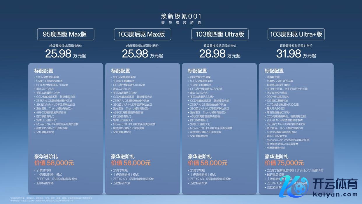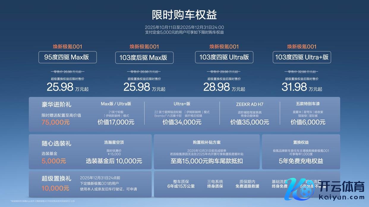 10月11日晚云开体育,焕新极氪001肃肃上市,新车共推出4款,指引价为26.98-32.98万元。在12月31日前下定,可享受1万元置换补贴等多项权利,限时置换价25.98-31.98万元。